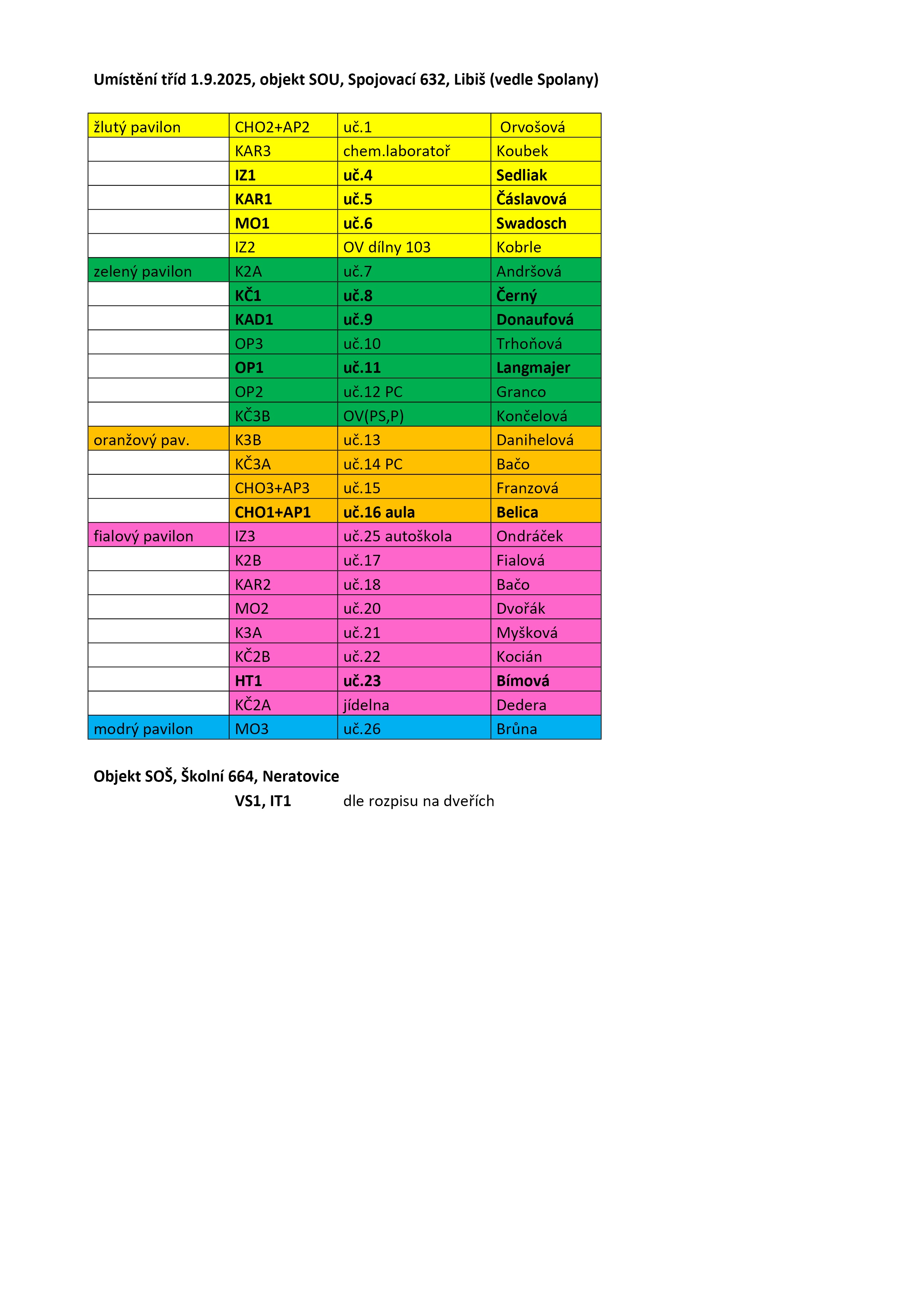Žáci 1. ročníků oboru IT1 a VS1 se dostaví v 8.00 do areálu SOŠ, Školní 664, Neratovice, rozpisy tříd budou vyvěšeny na dveřích