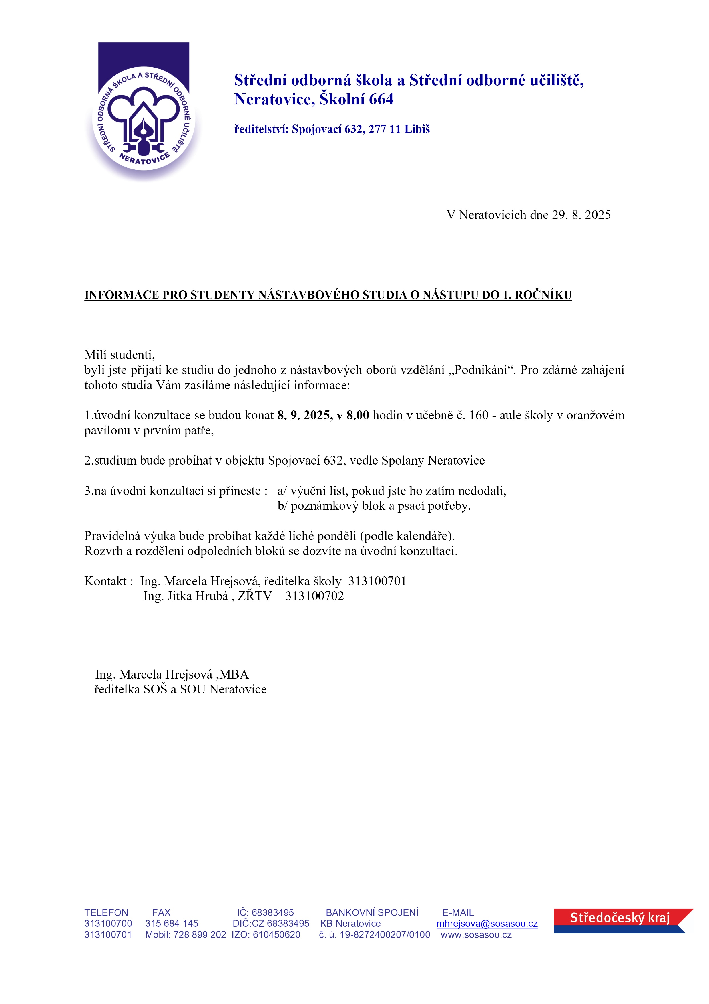 byli jste přijati ke studiu nástavbového oboru vzdělání „Podnikání“. Pro zdárné zahájení tohoto studia Vám zasíláme následující informace: