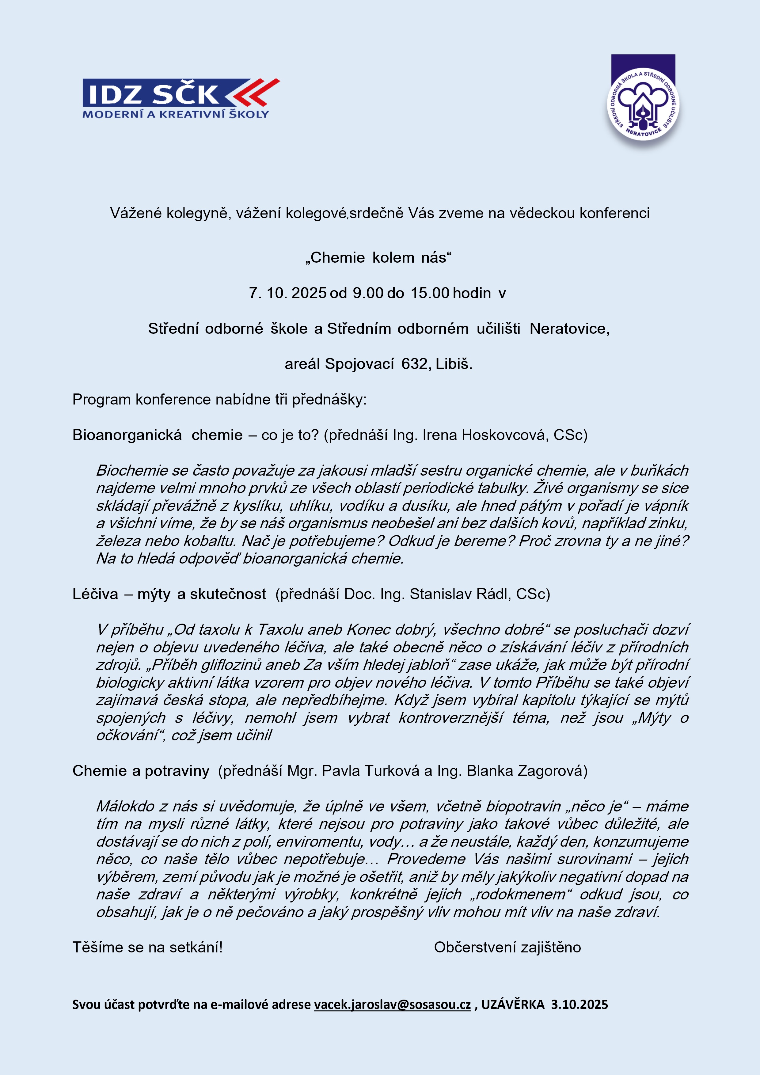 7. 10. 2025 od 9.00 do 14.00 na SOŠ a SOU Neratovice proběhne konference „Chemie kolem nás“.