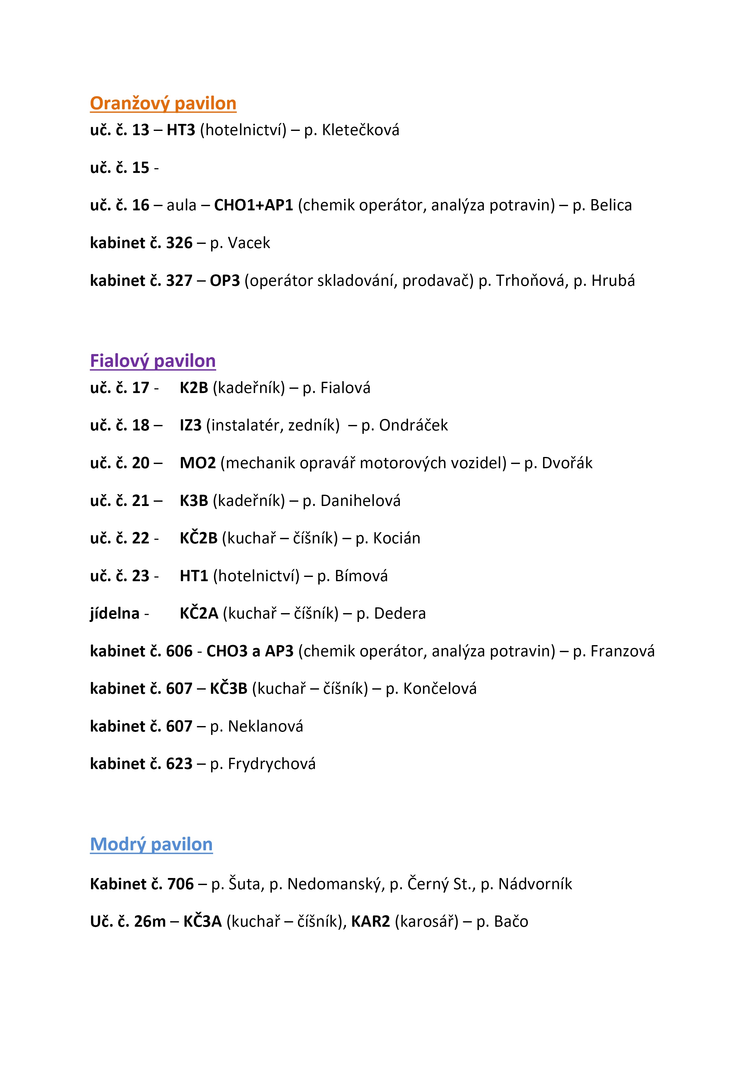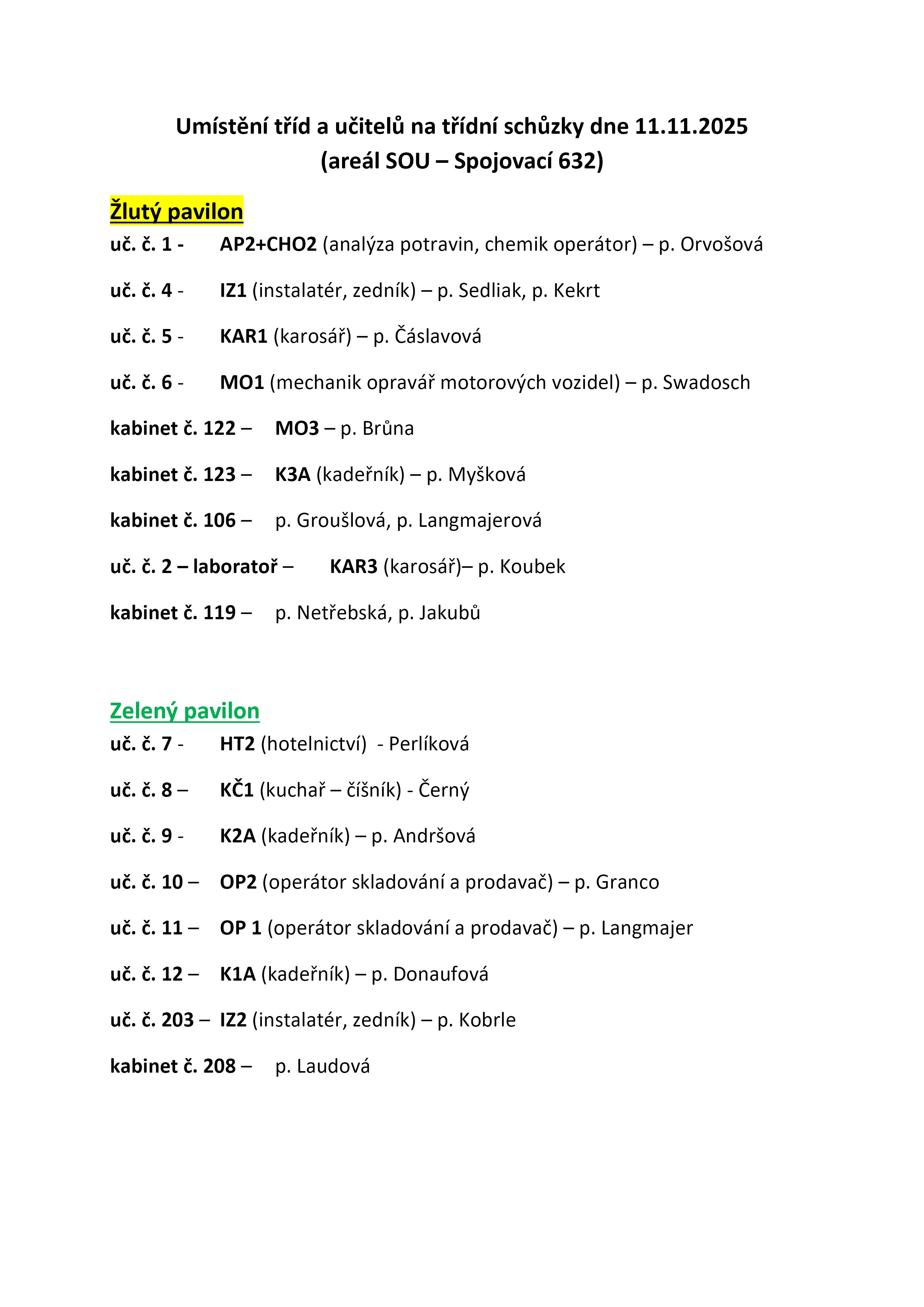 Umístění tříd a pedagogů na třídních schůzkách 11. 11. 2025. Seznam bude také vyvěšen na vrátnici a jednotlivých pavilonech