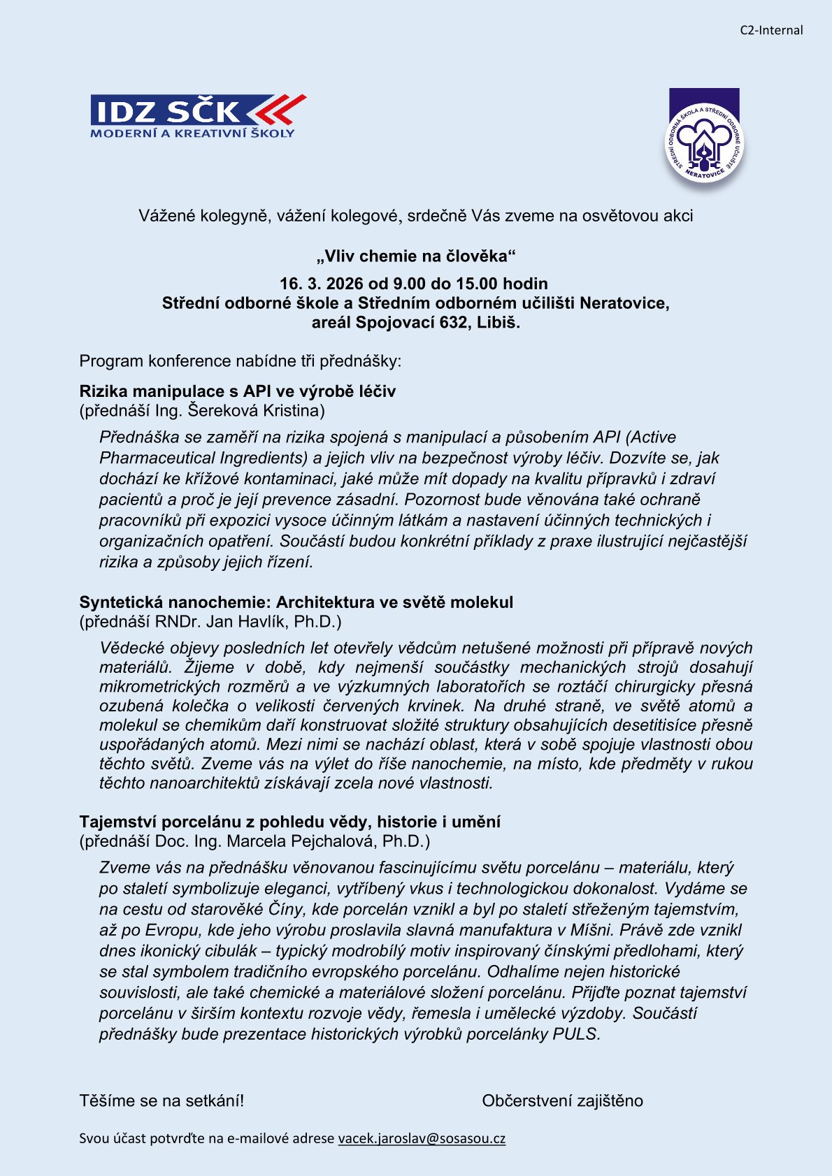 Rádi bychom Vás pozvali na osvětovou akci v rámci celoživotního vzdělávání, která proběhne 16. 3. 2026 od 9.00 - 15.00 v areálu SOU Spojovací 632, Libiš.