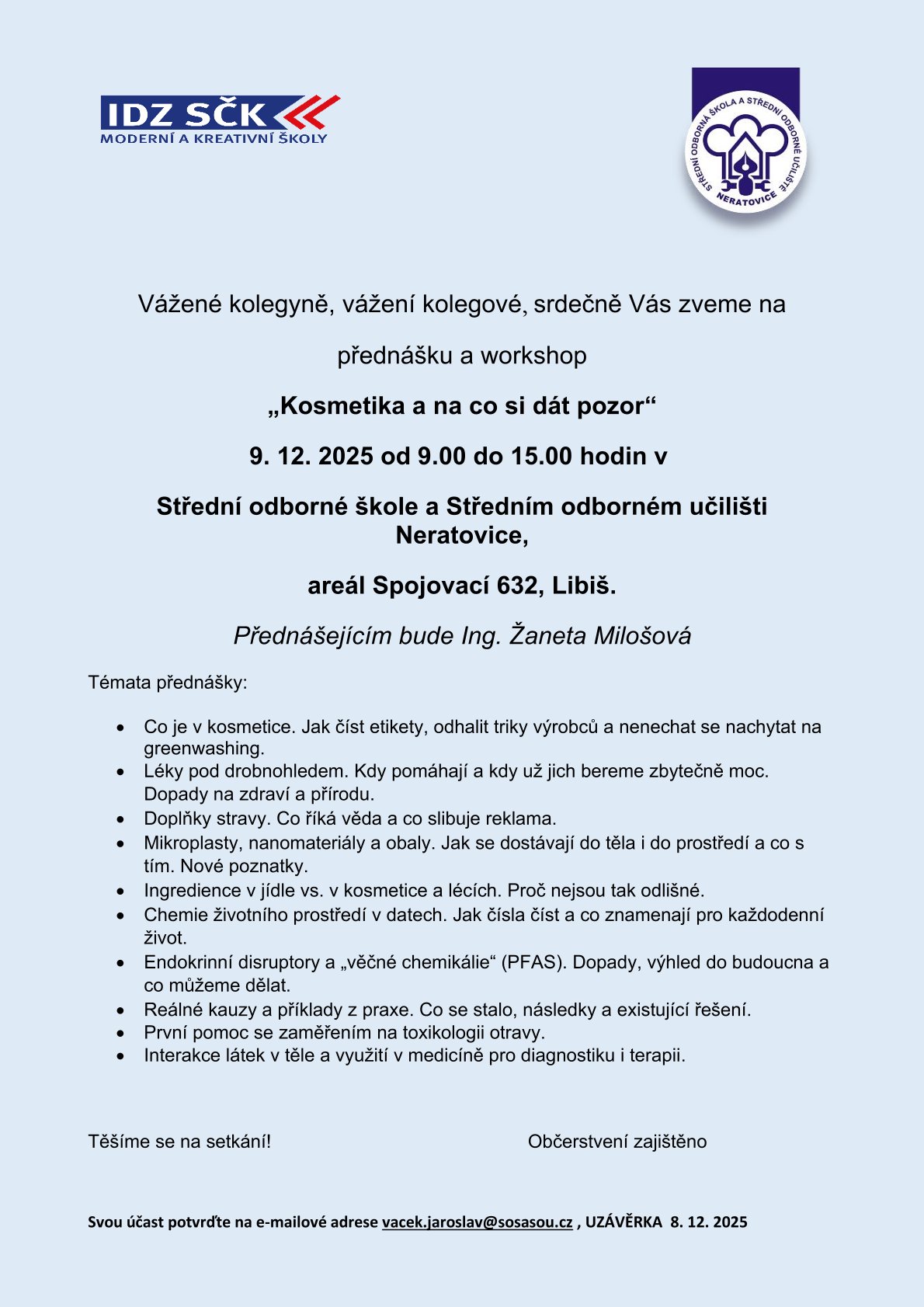 Rádi bychom Vás pozvali na přednášku a zároveň i workshop o kosmetice, které se budou konat na SOU, Spojovací 632, Libiš, v termínu 9. 12. 2025 .